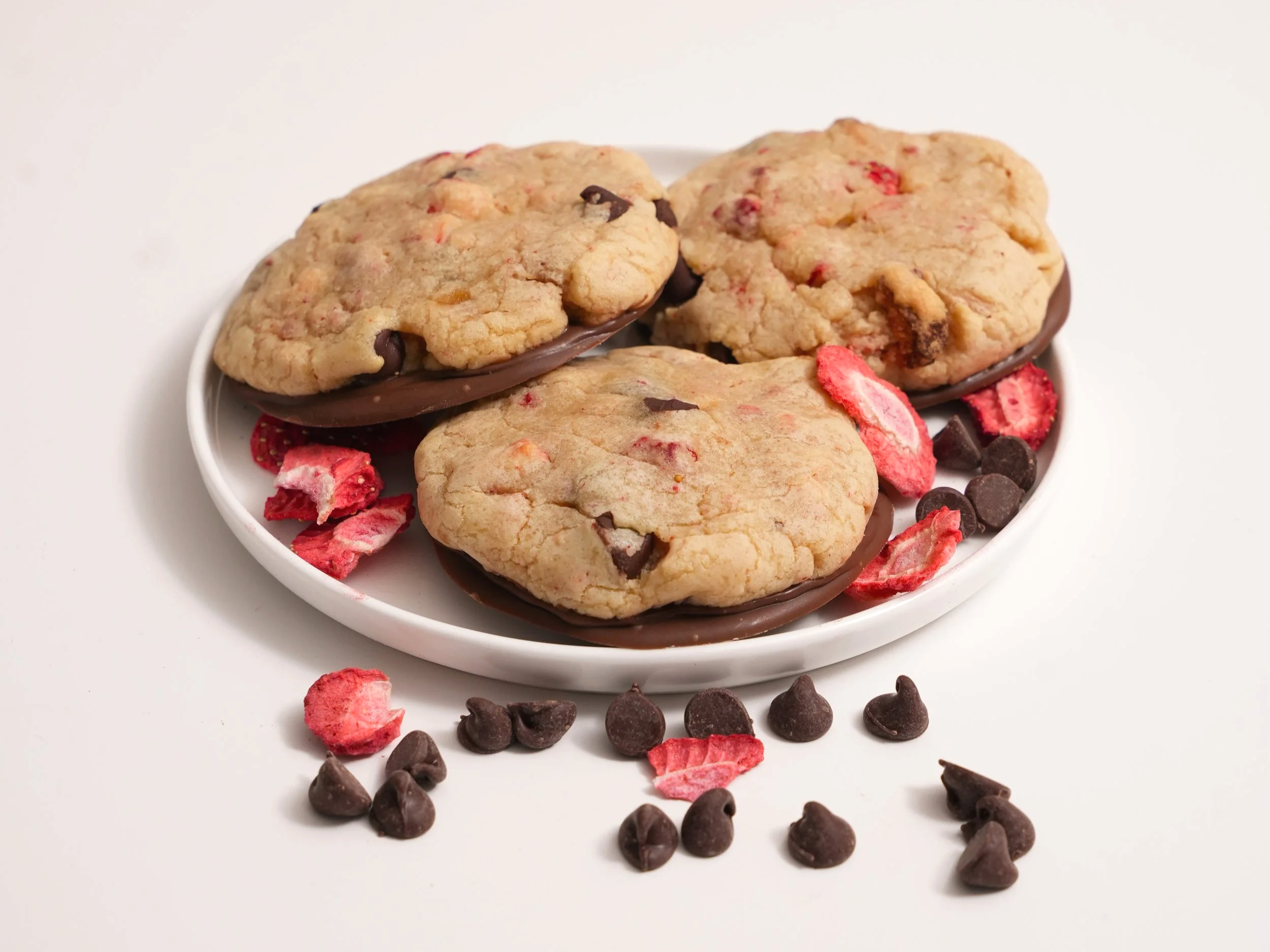 A classic chocolate chip cookie kissed with freeze-dried strawberries and finished with a rich chocolate-dipped bottom.
